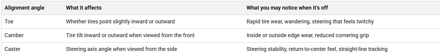 When alignment is correct, you’ll usually notice steadier tracking, smoother steering, and longer tire life. When alignment is off, the tire can scrub against the road at the wrong angle, which wears the tread faster and makes the car feel less stable.