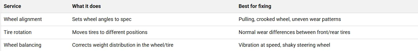 Rotate your tires on schedule and pay attention to wear patterns early. If your vehicle starts pulling or the steering wheel changes position, don’t wait for the tires to “show it.” Catching alignment issues early usually saves money.