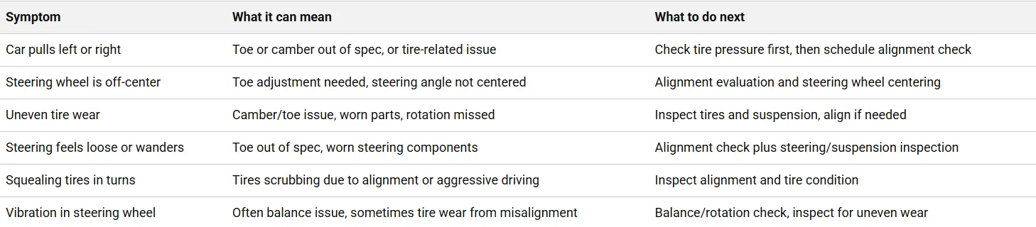If you notice any of the symptoms below, an alignment check is a smart next step. Some of these symptoms can also be caused by tire or suspension issues, which is why a professional inspection matters.