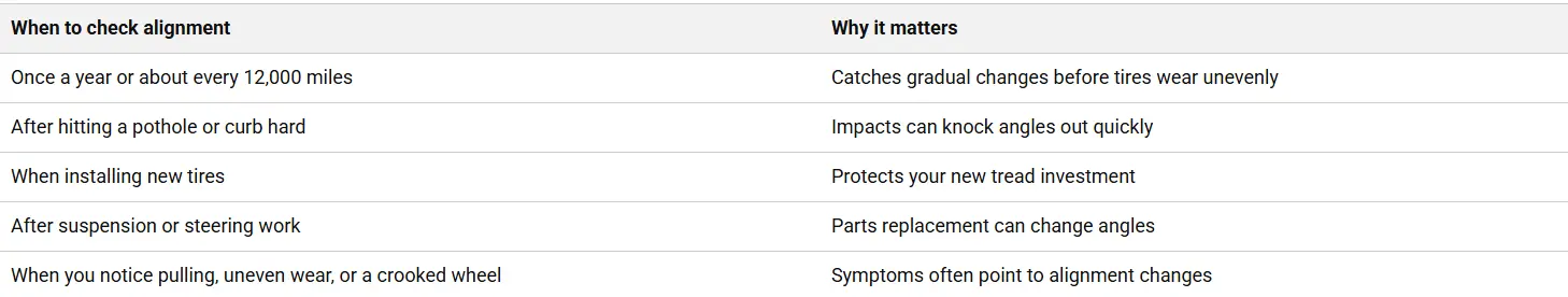 If you’re getting new tires, it’s smart to think about alignment at the same time. New tread on a misaligned car can wear unevenly faster than you’d expect.