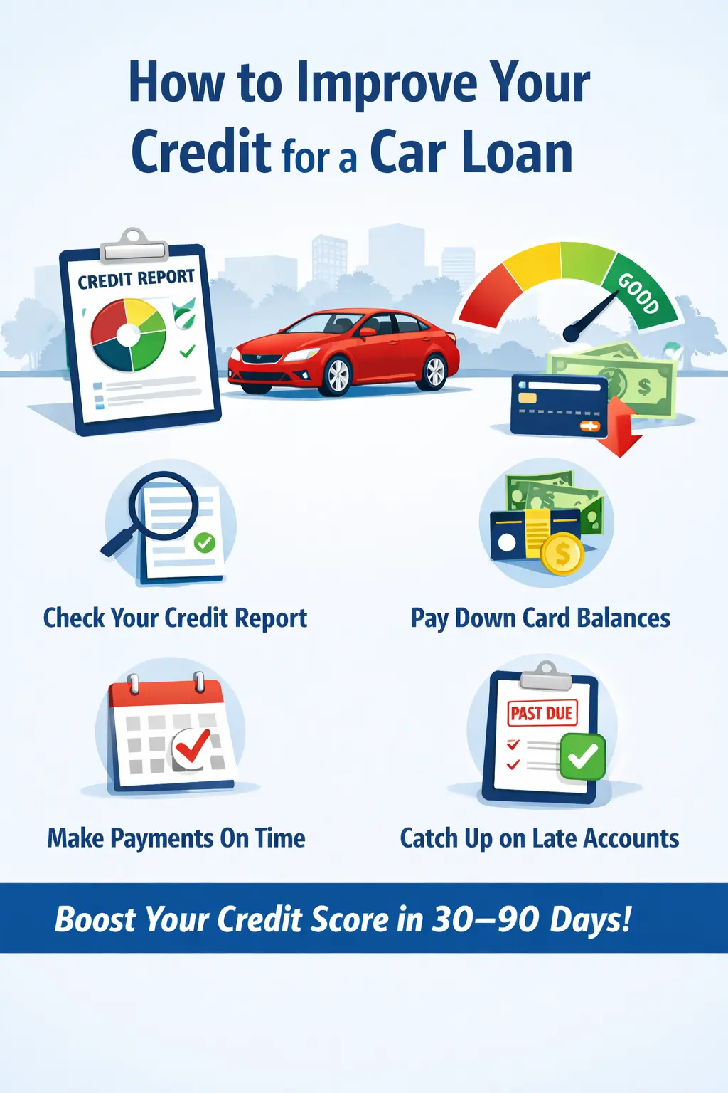 You can quickly improve your credit for a car loan by paying down credit card balances, making every payment on time, correcting errors on your credit report, and avoiding new credit applications.