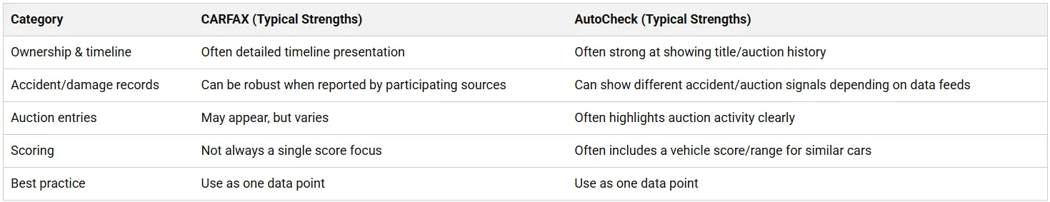 CARFAX and AutoCheck are two of the most common vehicle history report providers. They’re similar in purpose, but they can differ in coverage depending on where the car has been and which sources reported information.