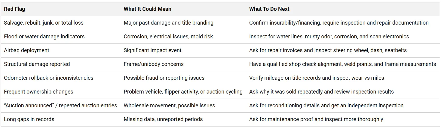 Flood/water damage, salvage or rebuilt branding, structural damage, airbag deployment, and mileage inconsistencies are the most important warnings to investigate before you buy.