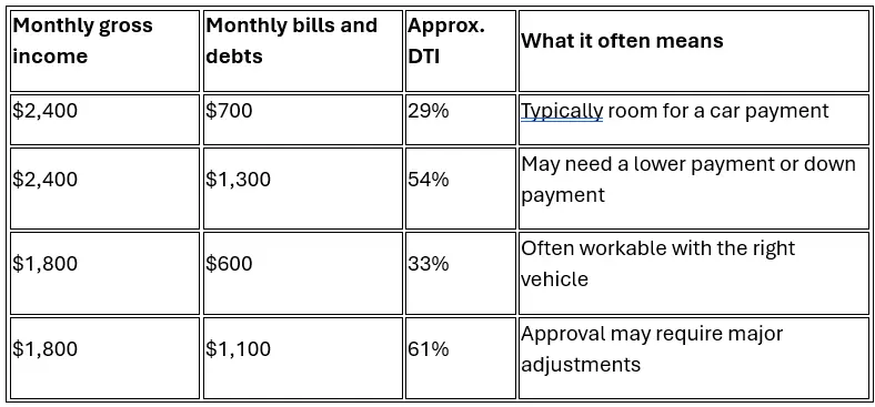 If your DTI is high, your income can look “not enough” even when your paycheck is decent. That’s why payment size and vehicle price matter so much.