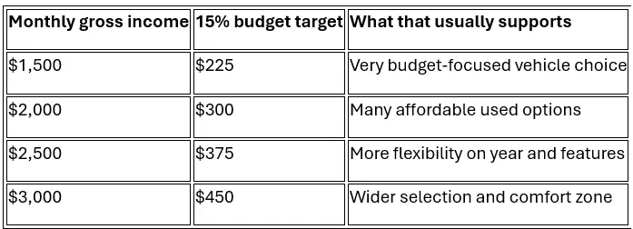 A practical budgeting guideline is keeping total vehicle costs under about 15% of your monthly income. Total vehicle costs include the payment, insurance, fuel, and basic upkeep.