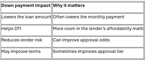 Yes, a down payment often makes approval easier. It reduces the amount you finance, which usually lowers the monthly payment and improves your DTI picture.