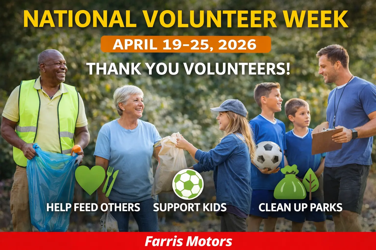 National Volunteer Week, celebrated April 19 to 25, 2026, is a simple invitation to do something good and to thank the people who already do. From all of us at Farris Motors, thank you to the volunteers who strengthen our community every day. We are proud to celebrate you, and we hope this week inspires more neighbors to join in.