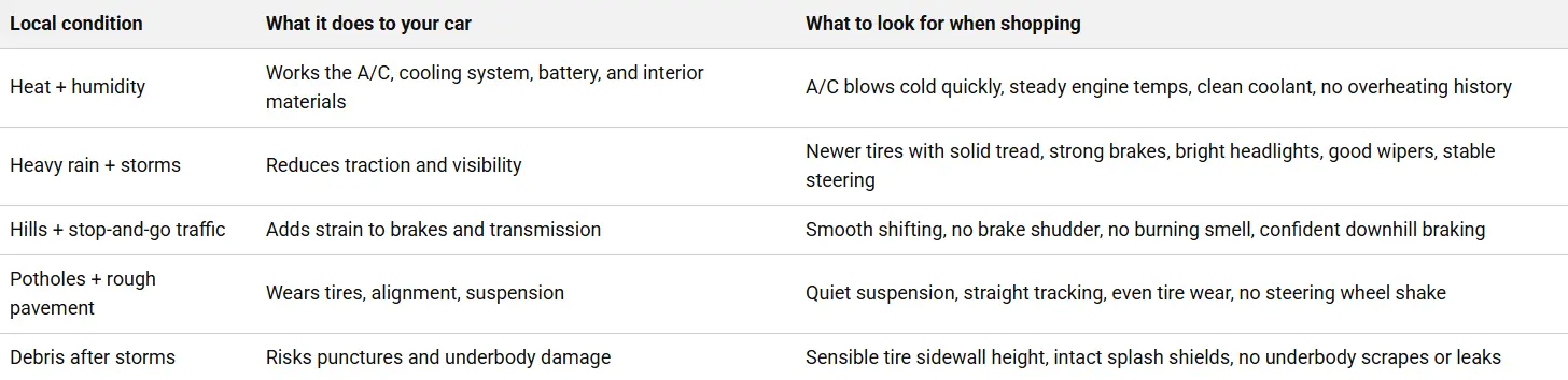 Avoid vehicles with uneven tire wear, clunking suspension noises, weak A/C, or signs of overheating. Also, be cautious with very large wheels and low-profile tires, since they tend to take more damage from potholes and rough pavement.