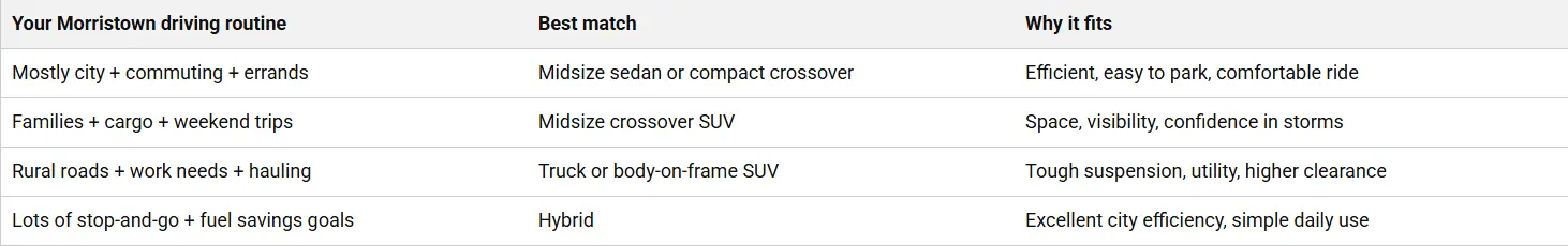 A sedan can be a great Morristown pick if you mainly drive paved roads and want better fuel economy. The key is skipping ultra-low-profile tires and choosing a model with a smooth ride and strong braking feel.