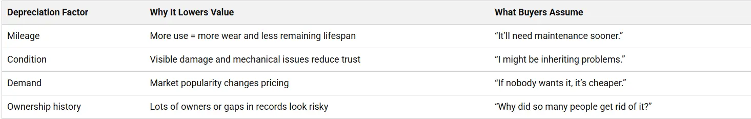 Depreciation is basically a “risk and usefulness” calculation. Buyers pay more when a vehicle looks dependable, has lots of life left, and matches what people are shopping for. Here’s how the big factors stack up.