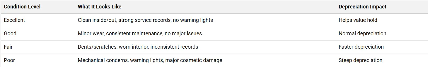 Condition can move a trade-in value significantly because dealers factor in reconditioning costs and how quickly the vehicle will sell. Tires, brakes, windshield condition, warning lights, odors, and visible damage are common value changers.