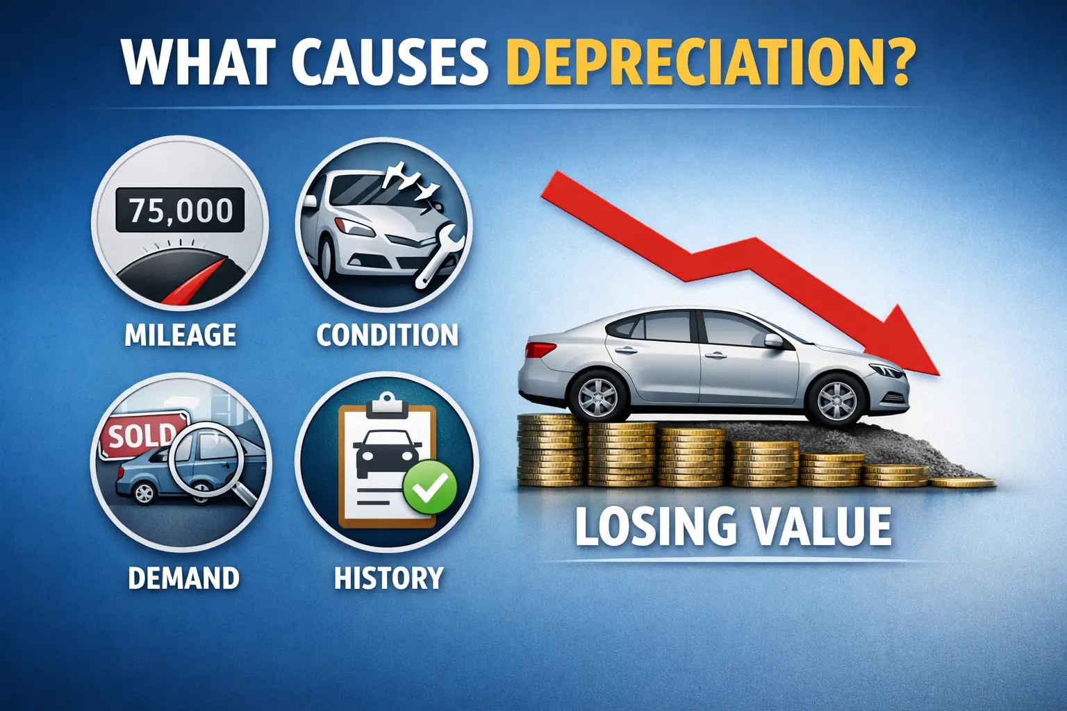 Car depreciation is mainly caused by time, mileage, wear and tear, market demand, and the story told by a vehicle’s ownership and service history.