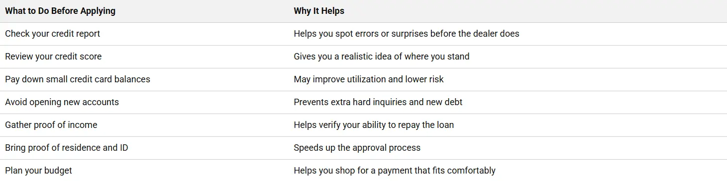 The best way to prepare is to review your own credit and organize your documents before you shop. A little preparation can make the process smoother and may even help you get better terms.
