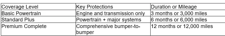 Farris Motor Company offers three core warranty tiers to suit varying budgets: