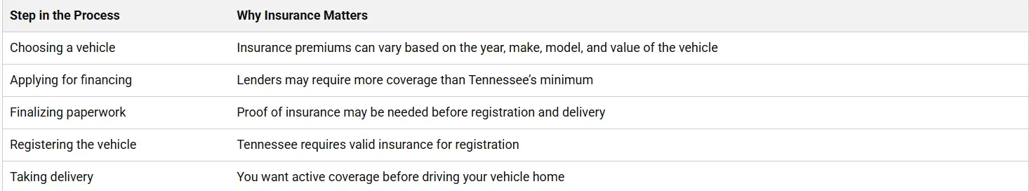 You should have insurance lined up before completing registration and taking delivery of the vehicle. In Tennessee, proof of valid coverage is an important part of the registration process. Having it ready helps avoid delays.